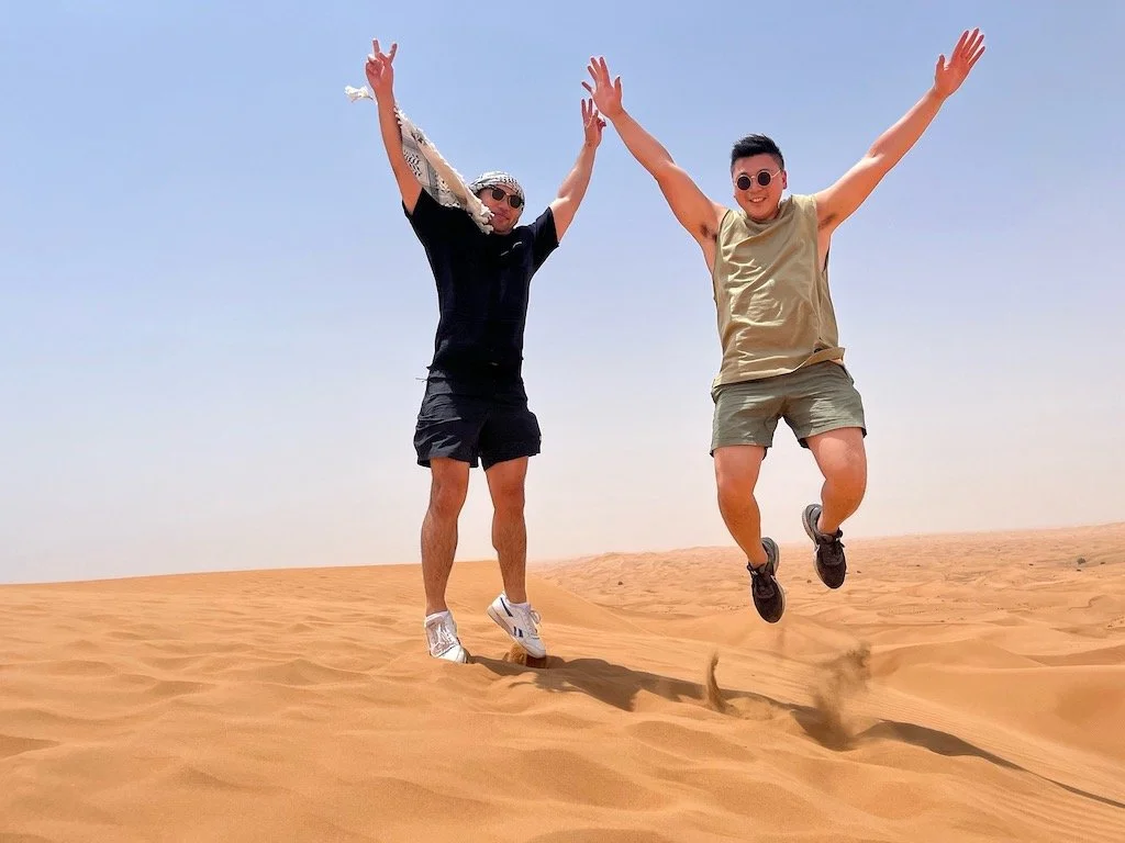 Die Safari geht weiter mit einem Dünen-Bashing durch die Wüste von Dubai, geführt von professionellen Fahrern. Dieser Teil der Tour beinhaltet Sandboarding auf den Dünen, sodass die Gäste aktiv mit der Wüstenlandschaft interagieren können.